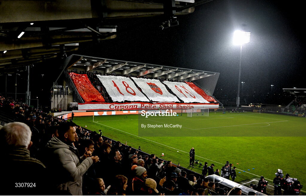 11 December 2025; Shelbourne supporters before the UEFA Conference League 2025/26 league phase match between Shelbourne and Crystal Palace at Tallaght Stadium in Dublin. Photo by Stephen McCarthy/Sportsfile