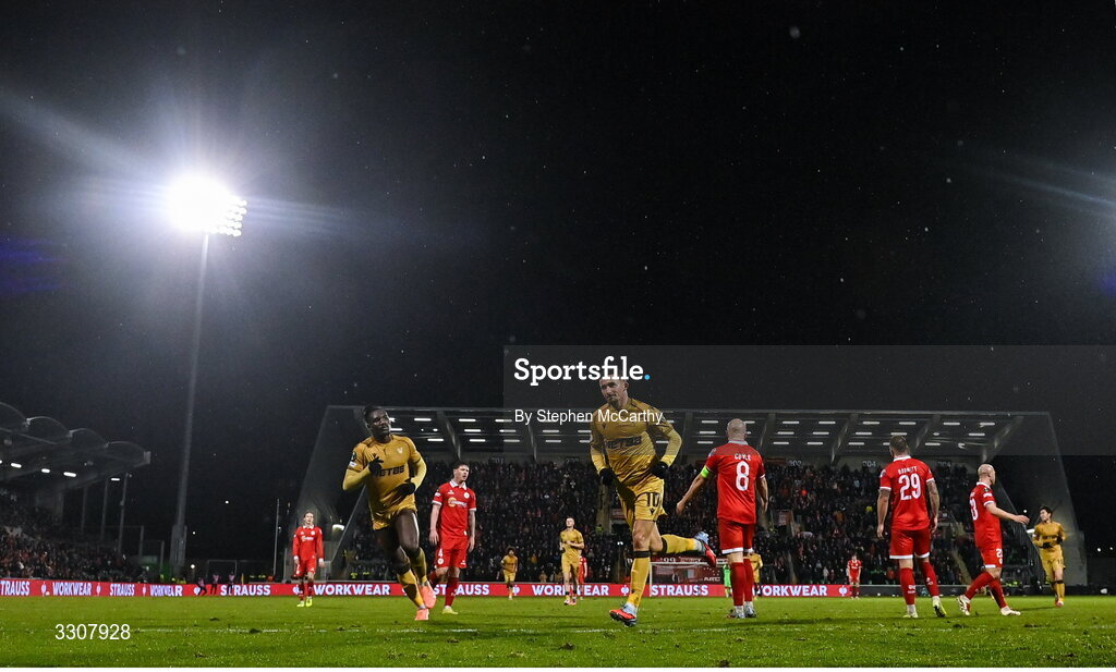 11 December 2025; Yeremy Pino of Crystal Palace, right, celebrates after scoring his side's third goal during the UEFA Conference League 2025/26 league phase match between Shelbourne and Crystal Palace at Tallaght Stadium in Dublin. Photo by Stephen McCarthy/Sportsfile