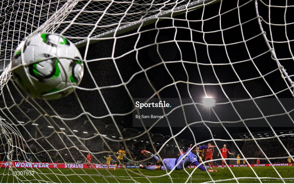 11 December 2025; Shelbourne goalkeeper Wessel Speel watches on as Yeremy Pino of Crystal Palace, hidden, scores his side's third goal during the UEFA Conference League 2025/26 league phase match between Shelbourne and Crystal Palace at Tallaght Stadium in Dublin. Photo by Sam Barnes/Sportsfile