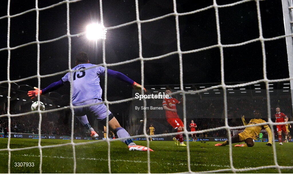 11 December 2025; Christantus Uche of Crystal Palace, right, shoots to score his side's first goal during the UEFA Conference League 2025/26 league phase match between Shelbourne and Crystal Palace at Tallaght Stadium in Dublin. Photo by Sam Barnes/Sportsfile