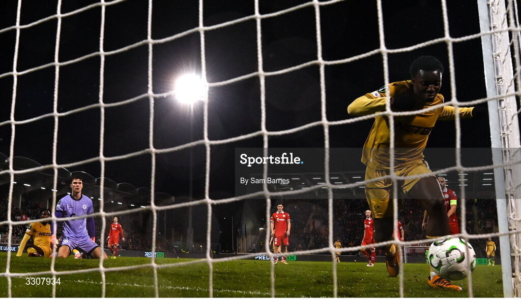 11 December 2025; Eddie Nketiah of Crystal Palace shoots to score his side's second goal during the UEFA Conference League 2025/26 league phase match between Shelbourne and Crystal Palace at Tallaght Stadium in Dublin. Photo by Sam Barnes/Sportsfile