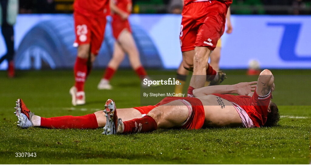 11 December 2025; Sean Boyd of Shelbourne reacts to a missed opportunity on goal during the UEFA Conference League 2025/26 league phase match between Shelbourne and Crystal Palace at Tallaght Stadium in Dublin. Photo by Stephen McCarthy/Sportsfile
