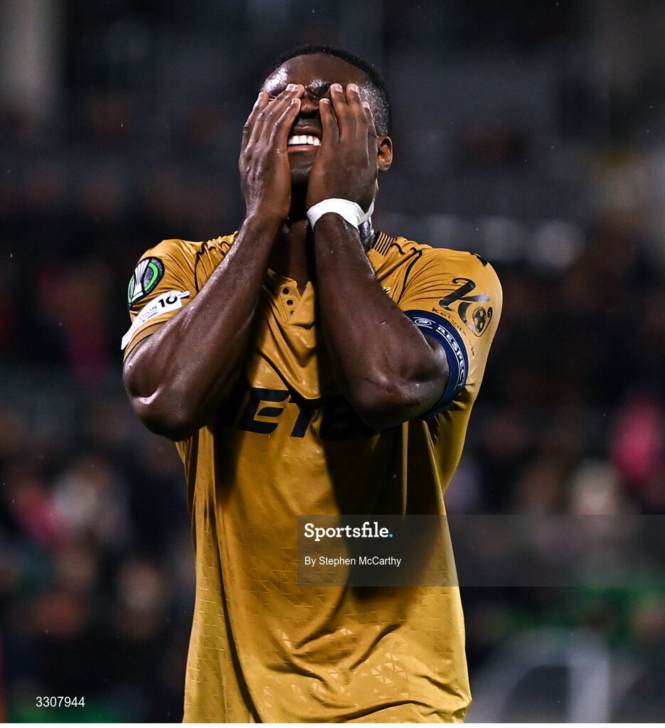 11 December 2025; Marc Guéhi of Crystal Palace reacts to a missed opportunity on goal during the UEFA Conference League 2025/26 league phase match between Shelbourne and Crystal Palace at Tallaght Stadium in Dublin. Photo by Stephen McCarthy/Sportsfile