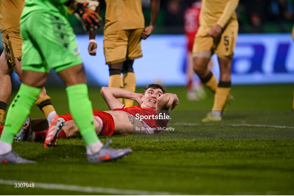 11 December 2025; Sean Boyd of Shelbourne reacts to a missed opportunity on goal during the UEFA Conference League 2025/26 league phase match between Shelbourne and Crystal Palace at Tallaght Stadium in Dublin. Photo by Stephen McCarthy/Sportsfile