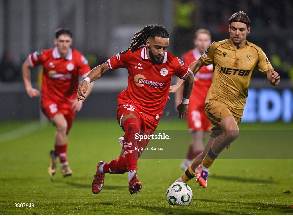 11 December 2025; Milan Mbeng of Shelbourne in action against Borna Sosa of Crystal Palace during the UEFA Conference League 2025/26 league phase match between Shelbourne and Crystal Palace at Tallaght Stadium in Dublin. Photo by Sam Barnes/Sportsfile