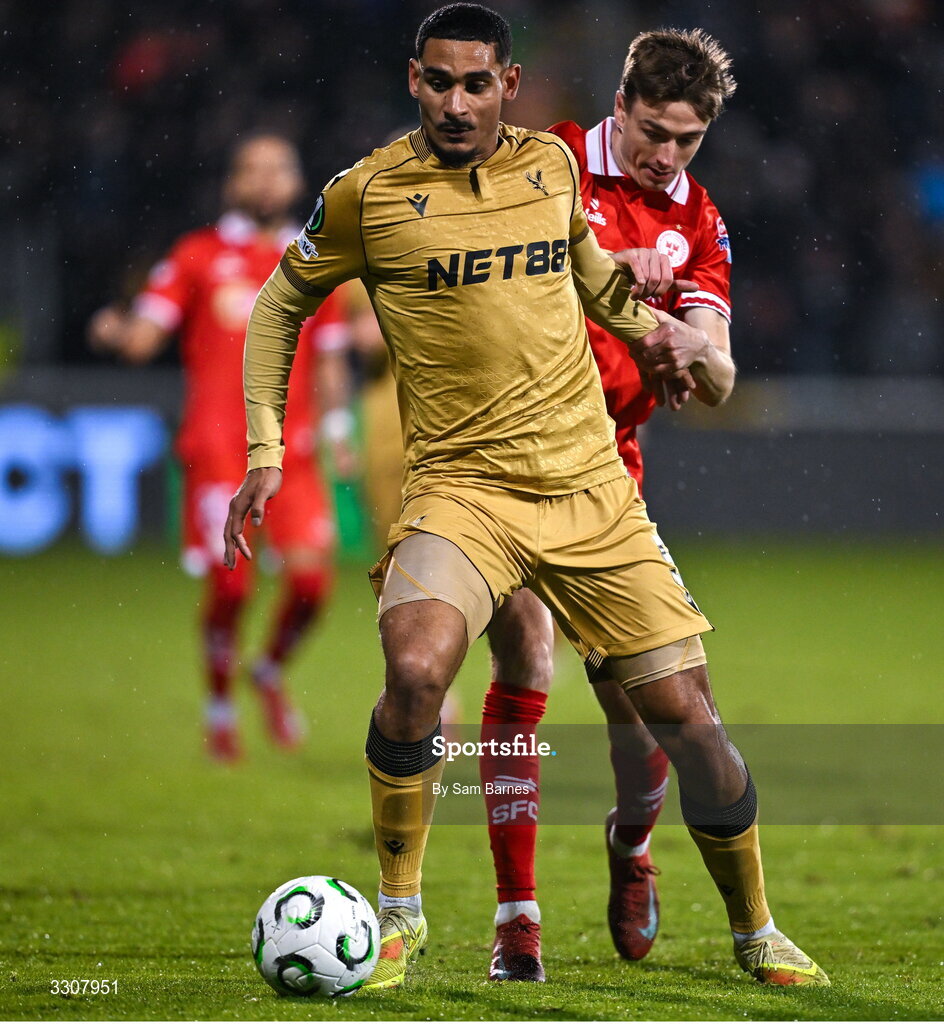 11 December 2025; Daniel Kelly of Shelbourne in action against Maxence Lacroix of Crystal Palace during the UEFA Conference League 2025/26 league phase match between Shelbourne and Crystal Palace at Tallaght Stadium in Dublin. Photo by Sam Barnes/Sportsfile