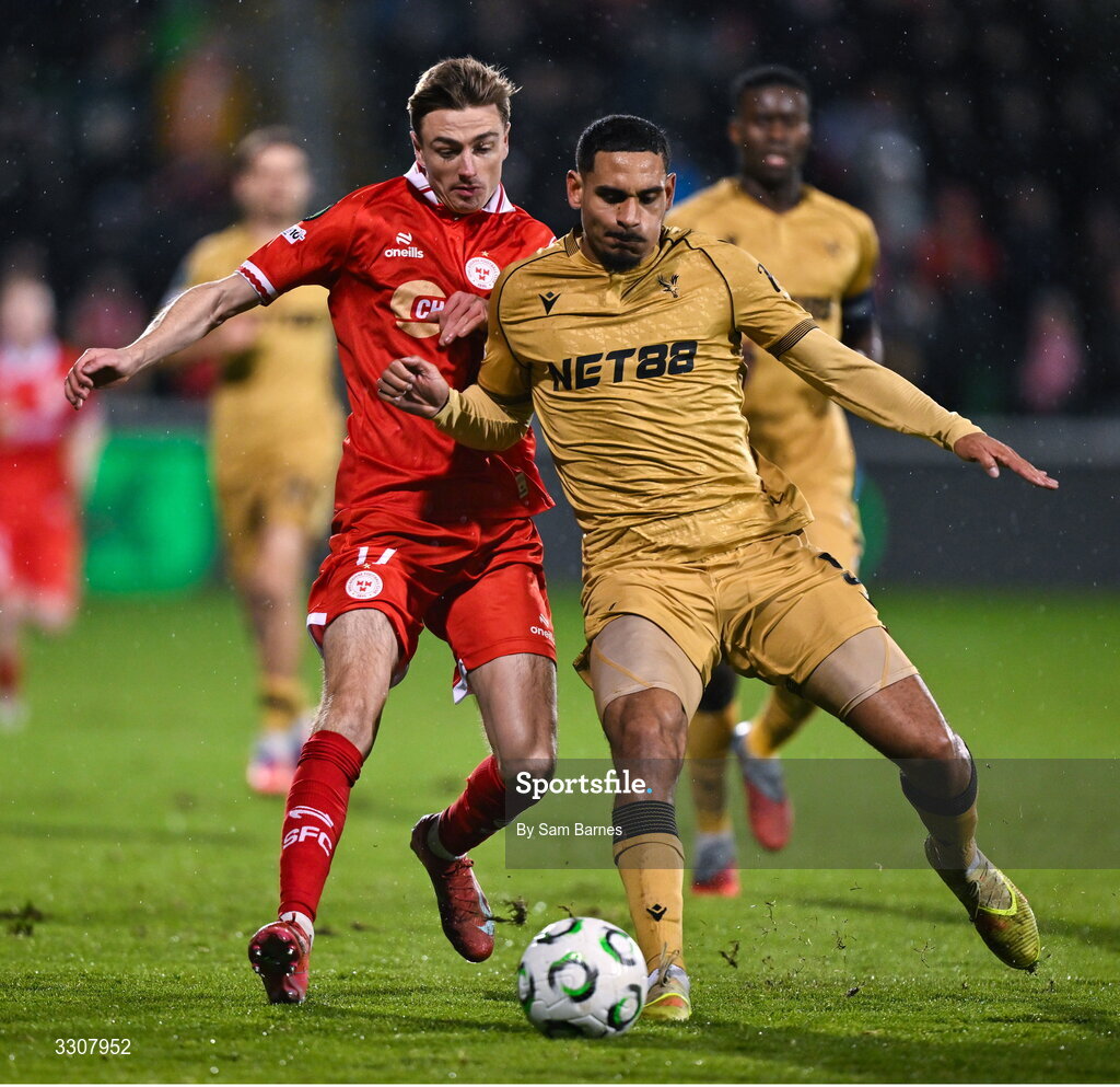 11 December 2025; Daniel Kelly of Shelbourne in action against Maxence Lacroix of Crystal Palace during the UEFA Conference League 2025/26 league phase match between Shelbourne and Crystal Palace at Tallaght Stadium in Dublin. Photo by Sam Barnes/Sportsfile
