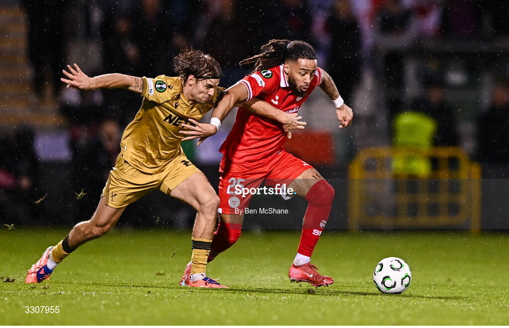 11 December 2025; Milan Mbeng of Shelbourne in action against Borna Sosa of Crystal Palace during the UEFA Conference League 2025/26 league phase match between Shelbourne and Crystal Palace at Tallaght Stadium in Dublin. Photo by Ben McShane/Sportsfile