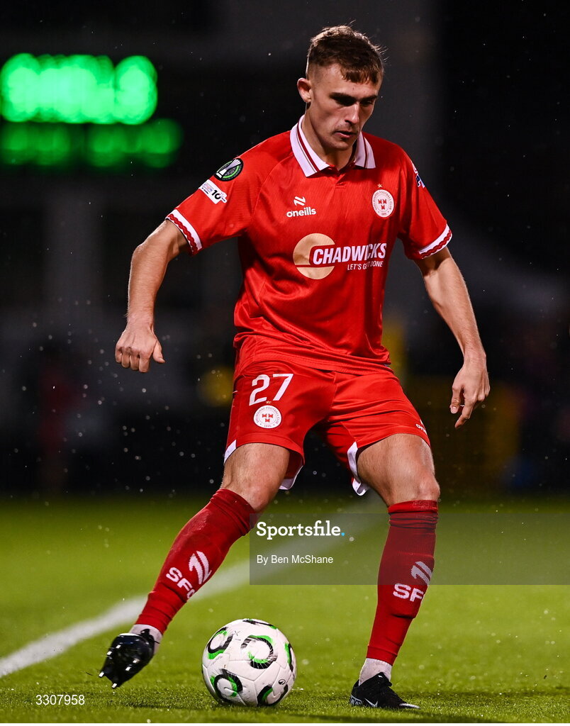 11 December 2025; Evan Caffrey of Shelbourne during the UEFA Conference League 2025/26 league phase match between Shelbourne and Crystal Palace at Tallaght Stadium in Dublin. Photo by Ben McShane/Sportsfile