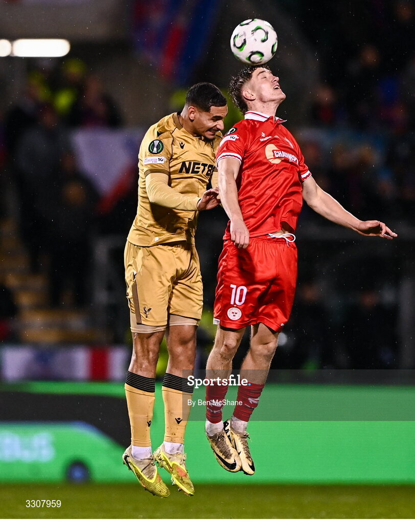11 December 2025; John Martin of Shelbourne in action against Maxence Lacroix of Crystal Palace during the UEFA Conference League 2025/26 league phase match between Shelbourne and Crystal Palace at Tallaght Stadium in Dublin. Photo by Ben McShane/Sportsfile