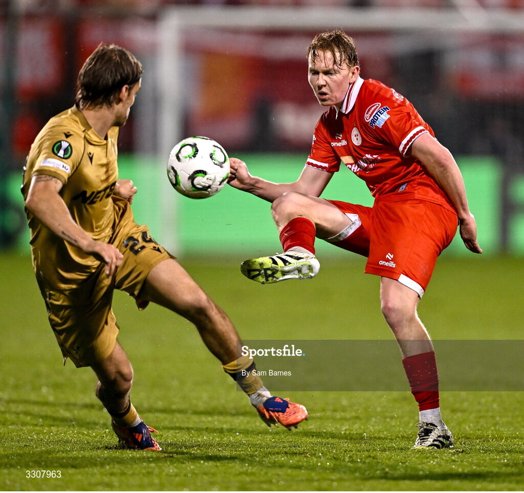 11 December 2025; Jack Henry-Francis of Shelbourne in action against Borna Sosa of Crystal Palace during the UEFA Conference League 2025/26 league phase match between Shelbourne and Crystal Palace at Tallaght Stadium in Dublin. Photo by Sam Barnes/Sportsfile