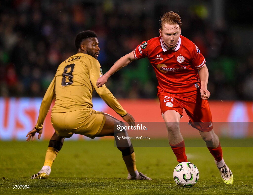 11 December 2025; Jack Henry-Francis of Shelbourne in action against Jefferson Lerma of Crystal Palace during the UEFA Conference League 2025/26 league phase match between Shelbourne and Crystal Palace at Tallaght Stadium in Dublin. Photo by Stephen McCarthy/Sportsfile