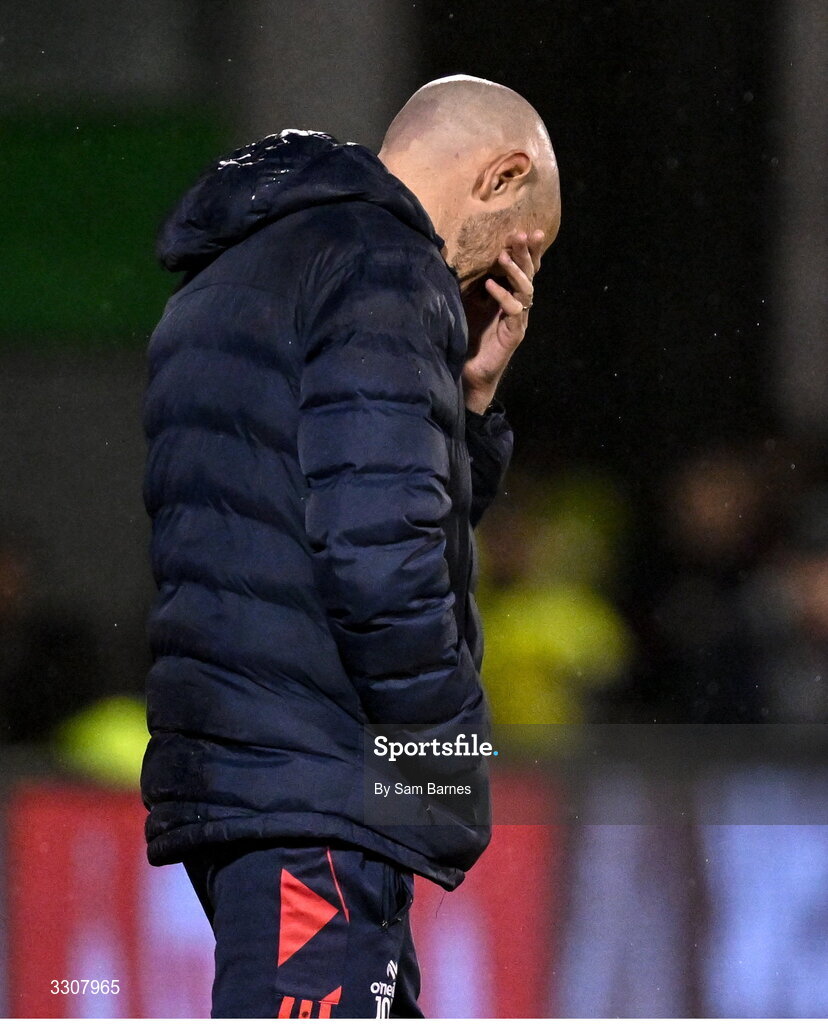 11 December 2025; Shelbourne head coach Joey O'Brien reacts during the UEFA Conference League 2025/26 league phase match between Shelbourne and Crystal Palace at Tallaght Stadium in Dublin. Photo by Sam Barnes/Sportsfile
