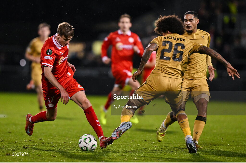 11 December 2025; Daniel Kelly of Shelbourne in action against Chris Richards of Crystal Palace during the UEFA Conference League 2025/26 league phase match between Shelbourne and Crystal Palace at Tallaght Stadium in Dublin. Photo by Sam Barnes/Sportsfile