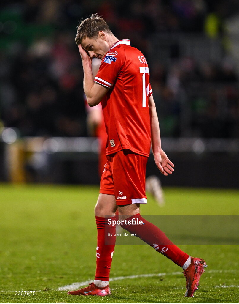 11 December 2025; Daniel Kelly of Shelbourne reacts during the UEFA Conference League 2025/26 league phase match between Shelbourne and Crystal Palace at Tallaght Stadium in Dublin. Photo by Sam Barnes/Sportsfile