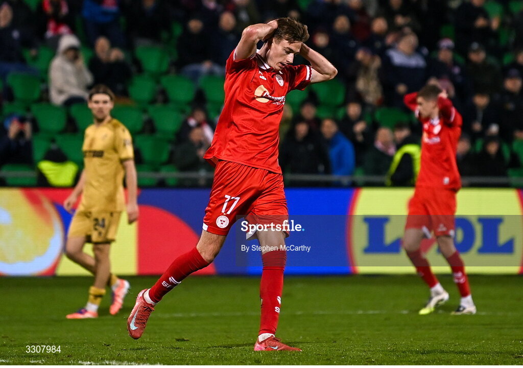 11 December 2025; Daniel Kelly of Shelbourne reacts to a missed opportunity on goal during the UEFA Conference League 2025/26 league phase match between Shelbourne and Crystal Palace at Tallaght Stadium in Dublin. Photo by Stephen McCarthy/Sportsfile