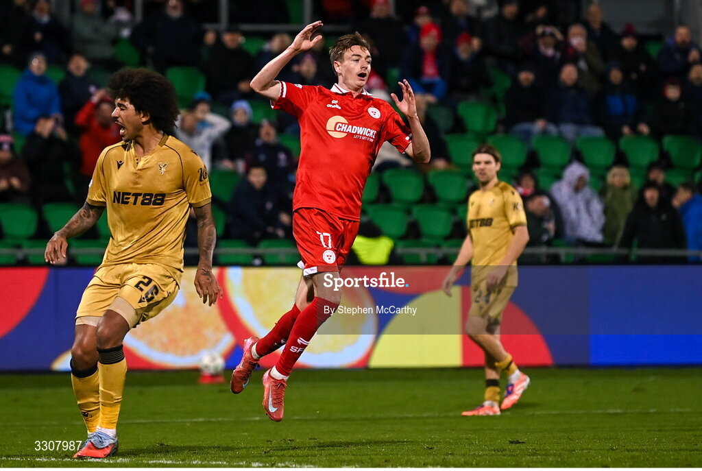 11 December 2025; Daniel Kelly of Shelbourne reacts to a missed opportunity on goal during the UEFA Conference League 2025/26 league phase match between Shelbourne and Crystal Palace at Tallaght Stadium in Dublin. Photo by Stephen McCarthy/Sportsfile