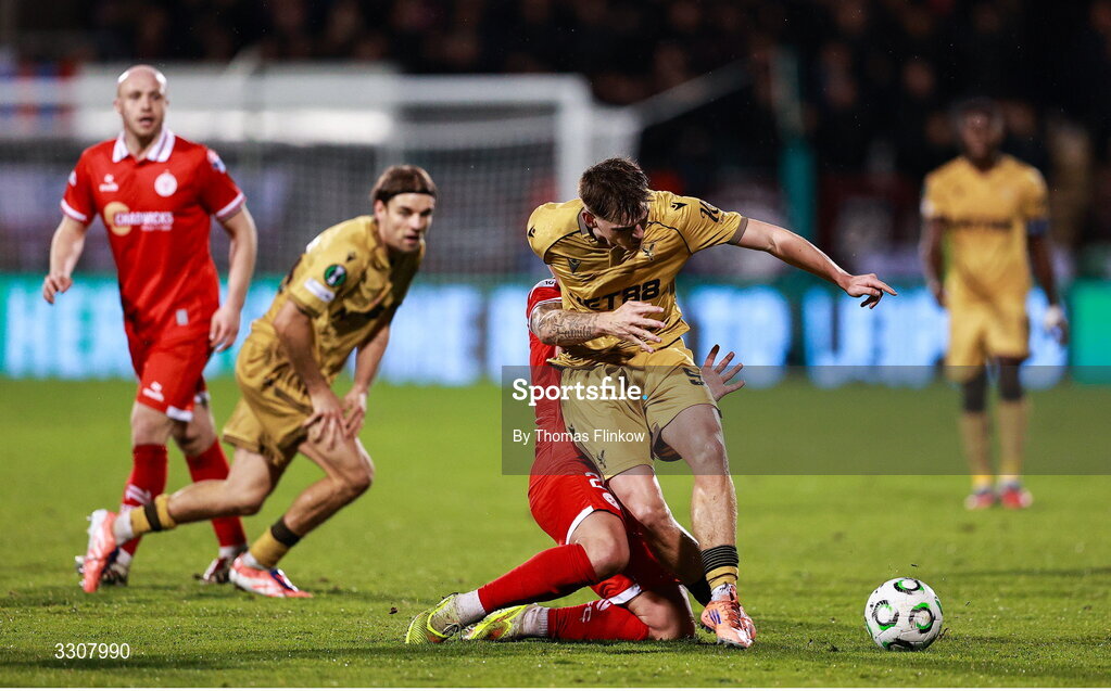 11 December 2025; Justin Devenny of Crystal Palace in action against Paddy Barrett of Shelbourne during the UEFA Conference League 2025/26 league phase match between Shelbourne and Crystal Palace at Tallaght Stadium in Dublin. Photo by Thomas Flinkow/Sportsfile