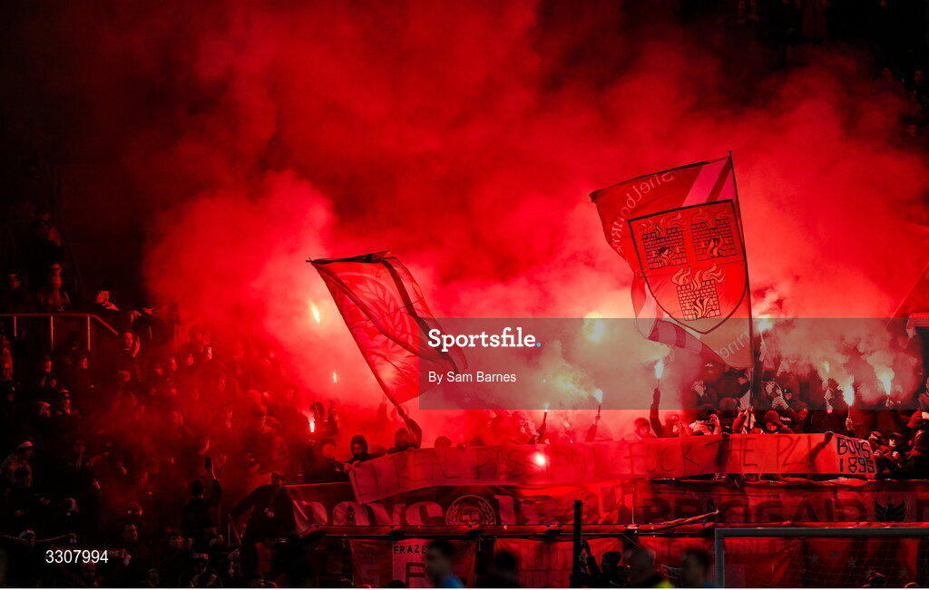 11 December 2025; (EDITOR'S NOTE; Image contains profanity) Shelbourne supporters after the UEFA Conference League 2025/26 league phase match between Shelbourne and Crystal Palace at Tallaght Stadium in Dublin. Photo by Sam Barnes/Sportsfile