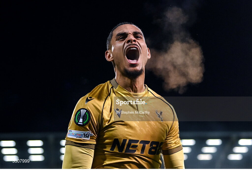11 December 2025; Maxence Lacroix of Crystal Palace celebrates after the UEFA Conference League 2025/26 league phase match between Shelbourne and Crystal Palace at Tallaght Stadium in Dublin. Photo by Stephen McCarthy/Sportsfile