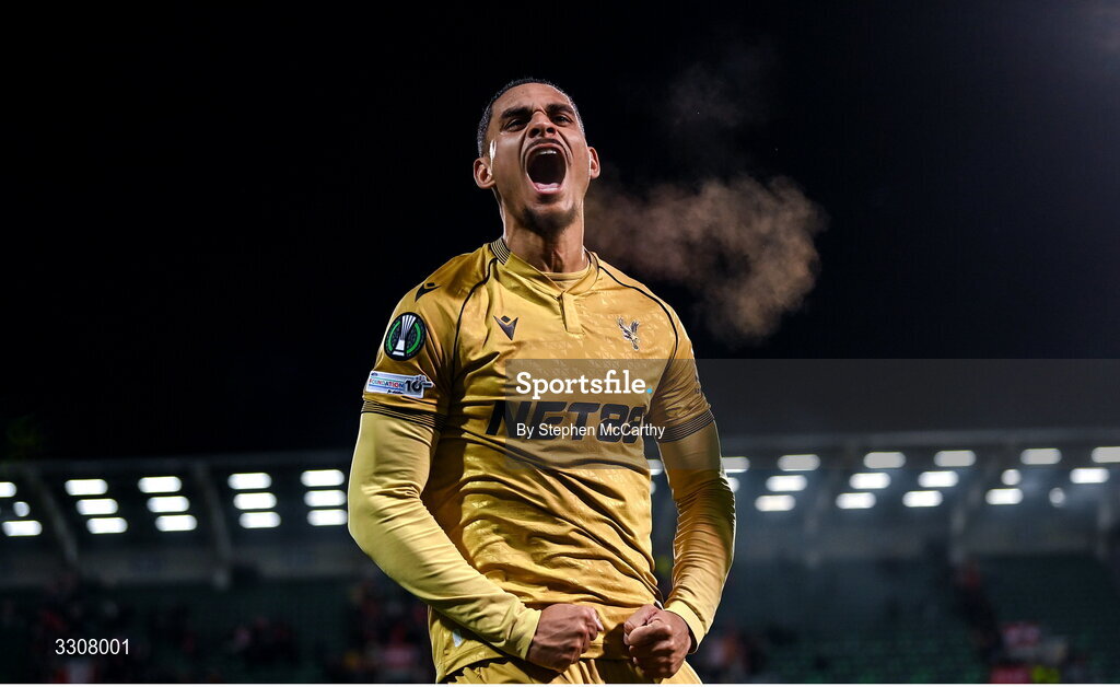 11 December 2025; Maxence Lacroix of Crystal Palace celebrates after the UEFA Conference League 2025/26 league phase match between Shelbourne and Crystal Palace at Tallaght Stadium in Dublin. Photo by Stephen McCarthy/Sportsfile