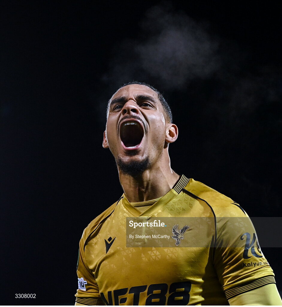 11 December 2025; Maxence Lacroix of Crystal Palace celebrates after the UEFA Conference League 2025/26 league phase match between Shelbourne and Crystal Palace at Tallaght Stadium in Dublin. Photo by Stephen McCarthy/Sportsfile