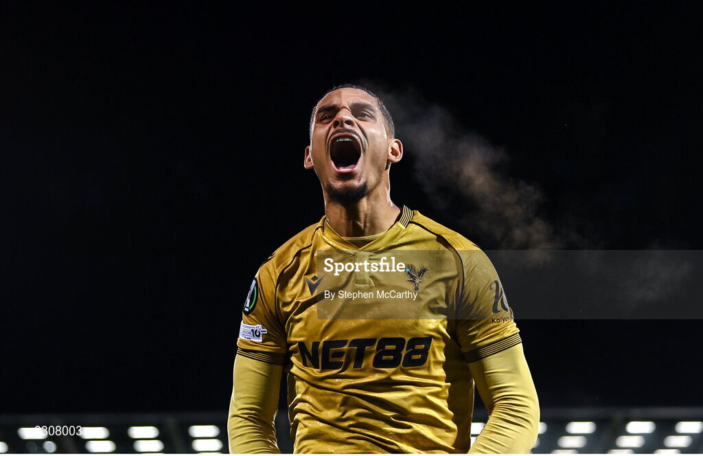 11 December 2025; Maxence Lacroix of Crystal Palace celebrates after the UEFA Conference League 2025/26 league phase match between Shelbourne and Crystal Palace at Tallaght Stadium in Dublin. Photo by Stephen McCarthy/Sportsfile