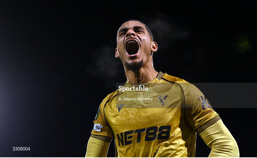 11 December 2025; Maxence Lacroix of Crystal Palace celebrates after the UEFA Conference League 2025/26 league phase match between Shelbourne and Crystal Palace at Tallaght Stadium in Dublin. Photo by Stephen McCarthy/Sportsfile