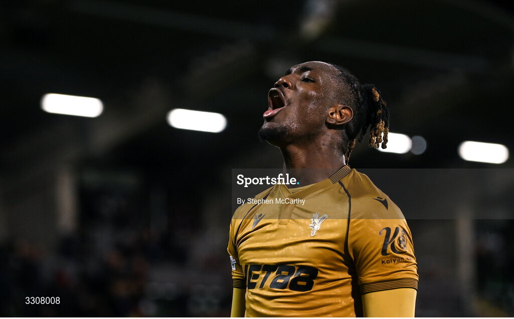 11 December 2025; Christantus Uche of Crystal Palace celebrates after the UEFA Conference League 2025/26 league phase match between Shelbourne and Crystal Palace at Tallaght Stadium in Dublin. Photo by Stephen McCarthy/Sportsfile