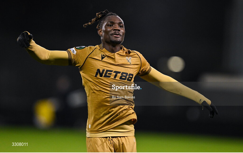 11 December 2025; Christantus Uche of Crystal Palace celebrates after the UEFA Conference League 2025/26 league phase match between Shelbourne and Crystal Palace at Tallaght Stadium in Dublin. Photo by Sam Barnes/Sportsfile