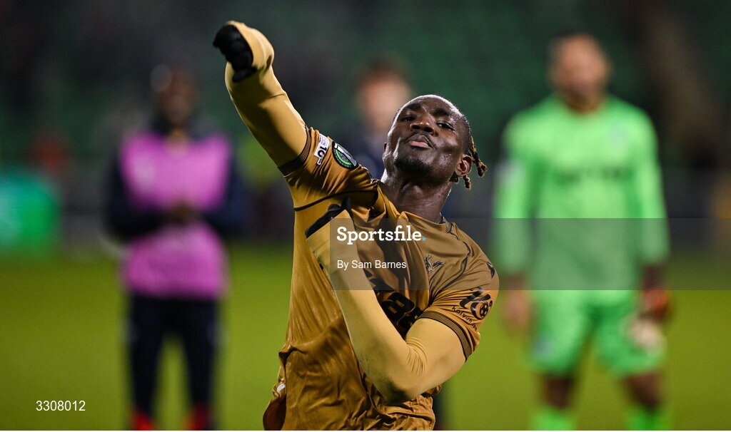 11 December 2025; Christantus Uche of Crystal Palace celebrates after the UEFA Conference League 2025/26 league phase match between Shelbourne and Crystal Palace at Tallaght Stadium in Dublin. Photo by Sam Barnes/Sportsfile