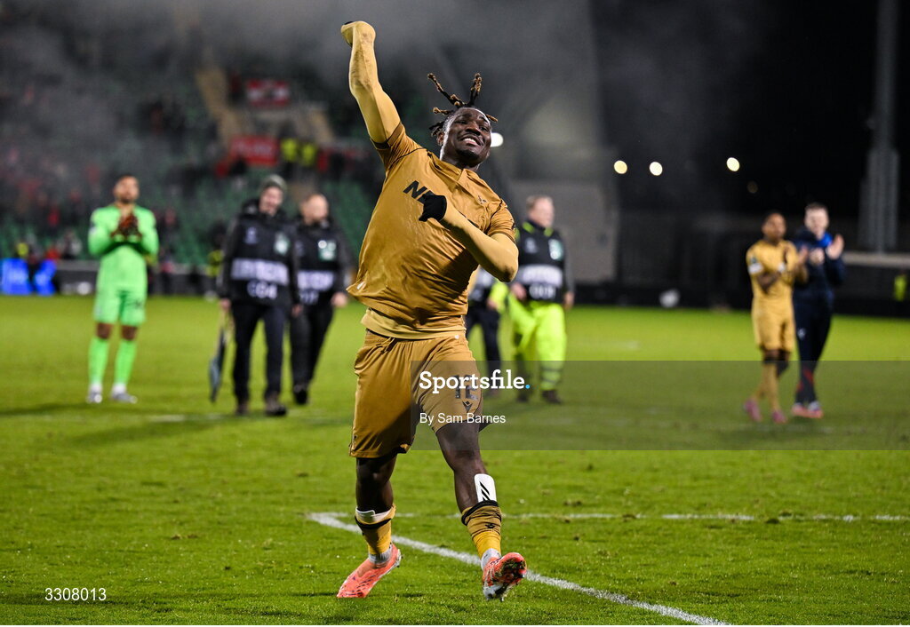 11 December 2025; Christantus Uche of Crystal Palace celebrates after the UEFA Conference League 2025/26 league phase match between Shelbourne and Crystal Palace at Tallaght Stadium in Dublin. Photo by Sam Barnes/Sportsfile