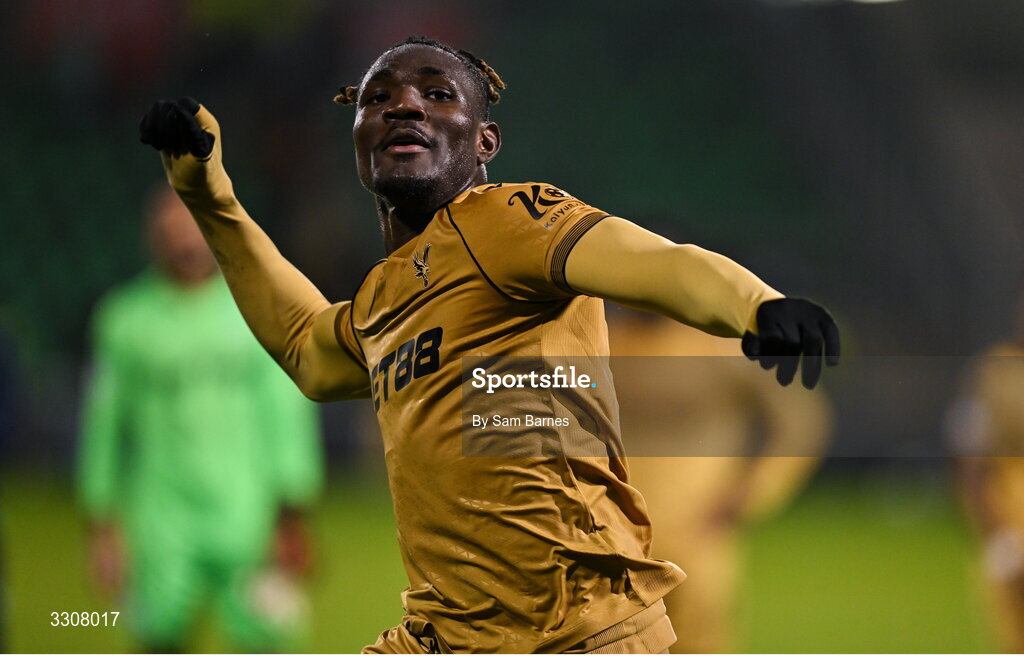 11 December 2025; Christantus Uche of Crystal Palace celebrates after the UEFA Conference League 2025/26 league phase match between Shelbourne and Crystal Palace at Tallaght Stadium in Dublin. Photo by Sam Barnes/Sportsfile