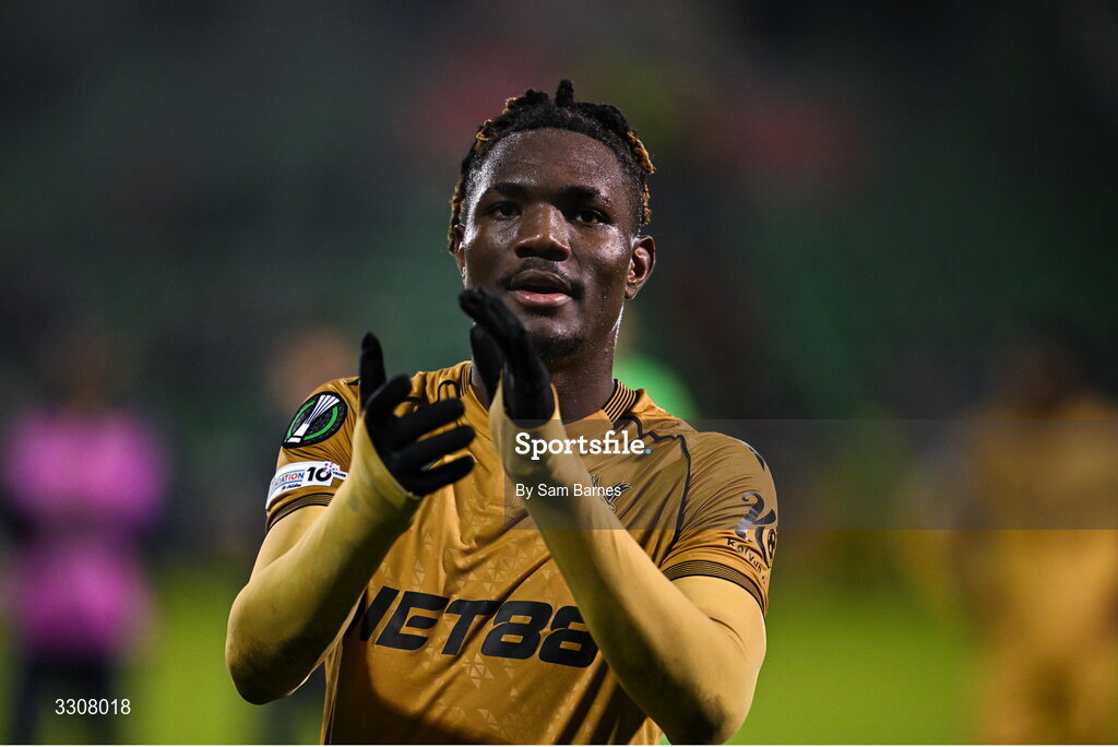 11 December 2025; Christantus Uche of Crystal Palace celebrates after the UEFA Conference League 2025/26 league phase match between Shelbourne and Crystal Palace at Tallaght Stadium in Dublin. Photo by Sam Barnes/Sportsfile