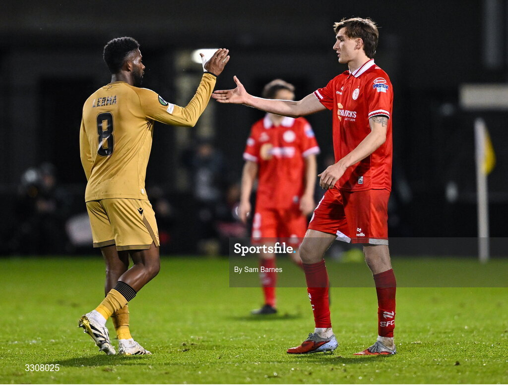 11 December 2025; Jefferson Lerma of Crystal Palace and Sean Boyd of Shelbourne after the UEFA Conference League 2025/26 league phase match between Shelbourne and Crystal Palace at Tallaght Stadium in Dublin. Photo by Sam Barnes/Sportsfile