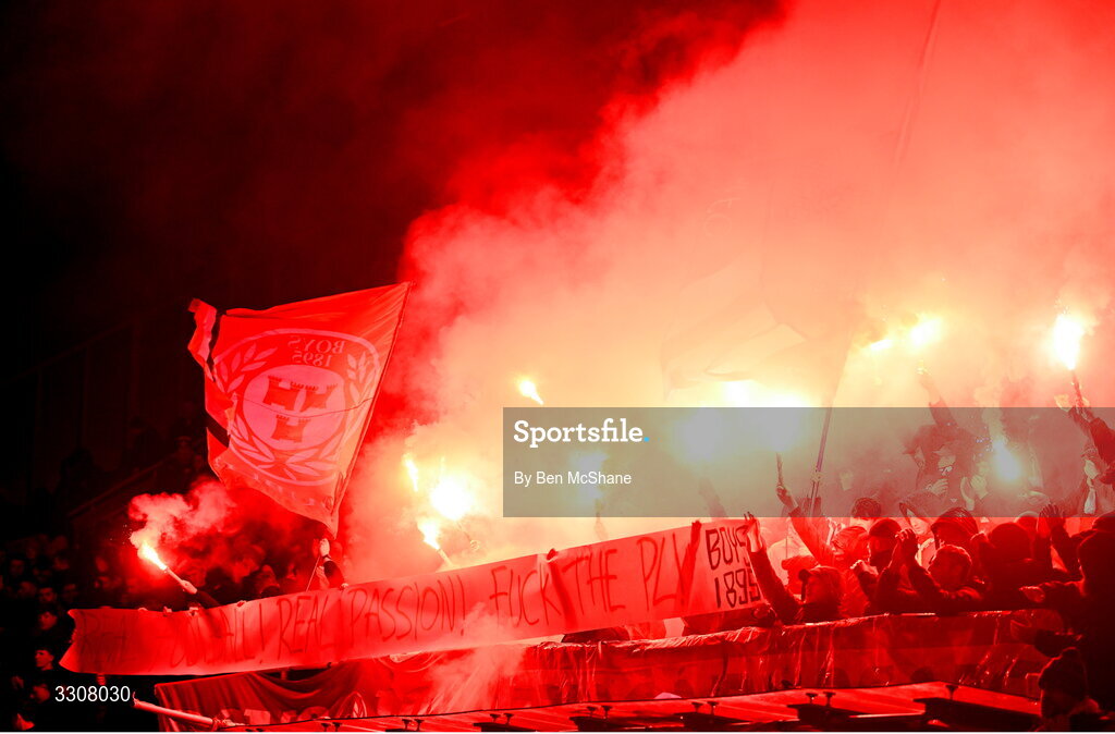 11 December 2025; (EDITOR'S NOTE; Image contains profanity) Shelbourne supporters after the UEFA Conference League 2025/26 league phase match between Shelbourne and Crystal Palace at Tallaght Stadium in Dublin. Photo by Ben McShane/Sportsfile