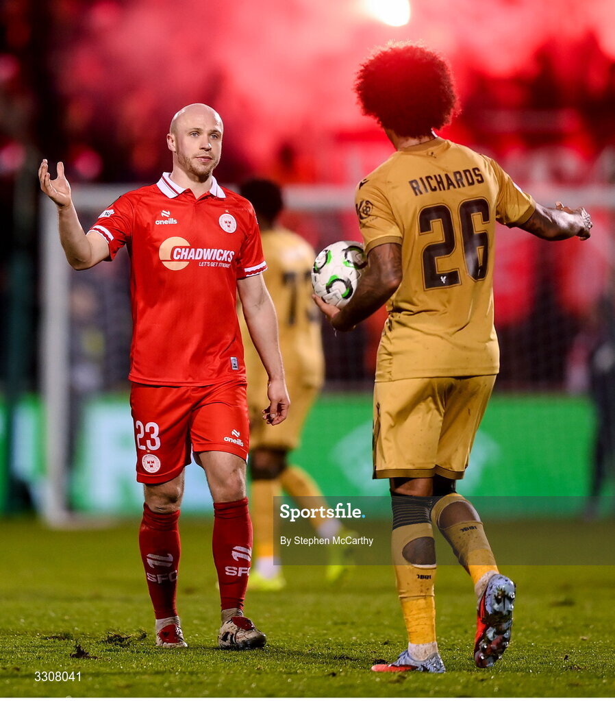 11 December 2025; Kerr McInroy of Shelbourne and Chris Richards of Crystal Palace after the UEFA Conference League 2025/26 league phase match between Shelbourne and Crystal Palace at Tallaght Stadium in Dublin. Photo by Stephen McCarthy/Sportsfile