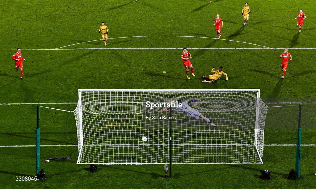 11 December 2025; Christantus Uche of Crystal Palace shoots to score his side's first goal during the UEFA Conference League 2025/26 league phase match between Shelbourne and Crystal Palace at Tallaght Stadium in Dublin. Photo by Sam Barnes/Sportsfile