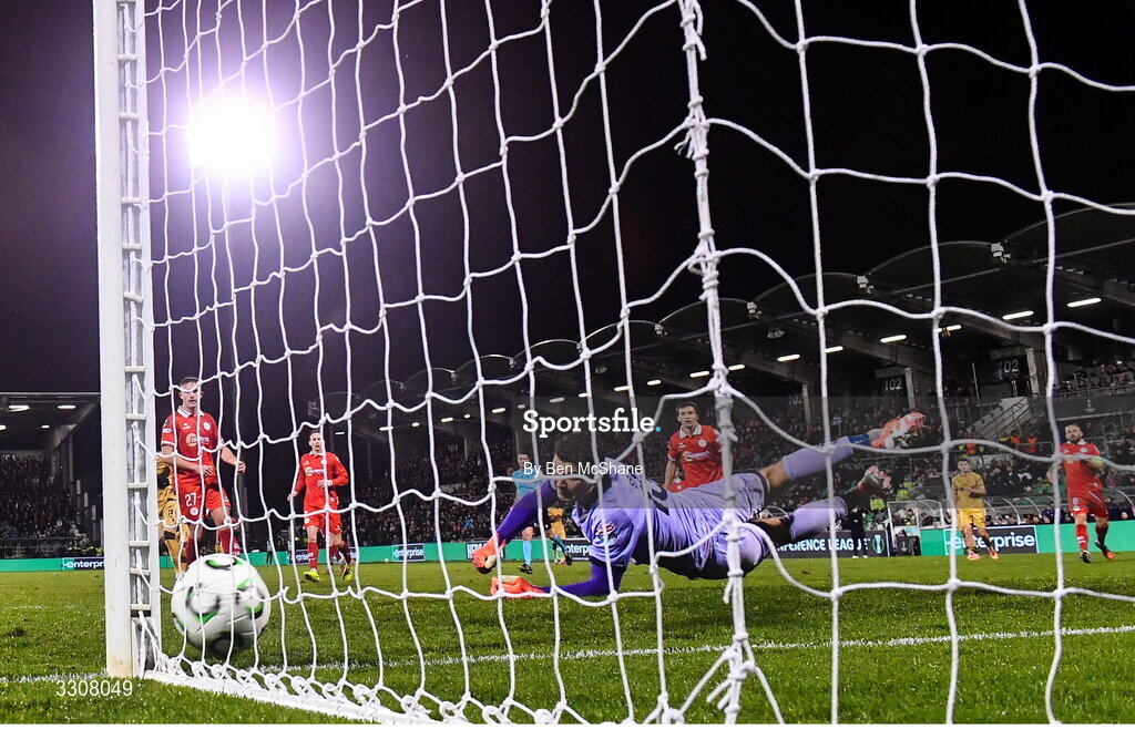 11 December 2025; Shelbourne goalkeeper Wessel Speel watches on as a shot on goal hits the post during the UEFA Conference League 2025/26 league phase match between Shelbourne and Crystal Palace at Tallaght Stadium in Dublin. Photo by Ben McShane/Sportsfile