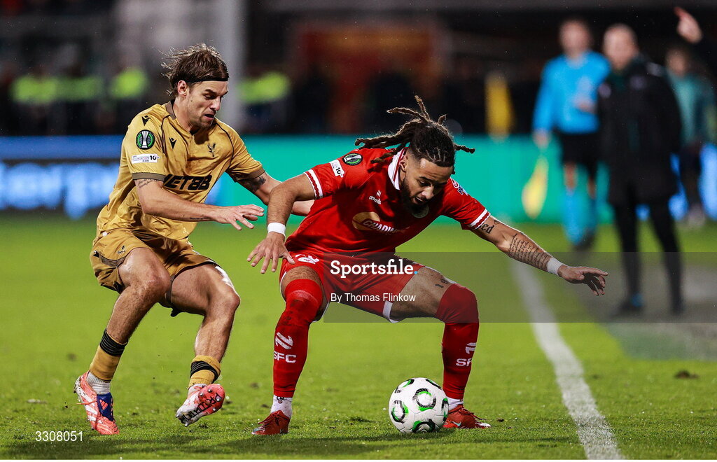 11 December 2025; Milan Mbeng of Shelbourne in action against Borna Sosa of Crystal Palace during the UEFA Conference League 2025/26 league phase match between Shelbourne and Crystal Palace at Tallaght Stadium in Dublin. Photo by Thomas Flinkow/Sportsfile