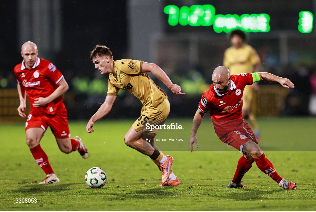 11 December 2025; Justin Devenny of Crystal Palace in action against Mark Coyle of Shelbourne during the UEFA Conference League 2025/26 league phase match between Shelbourne and Crystal Palace at Tallaght Stadium in Dublin. Photo by Thomas Flinkow/Sportsfile