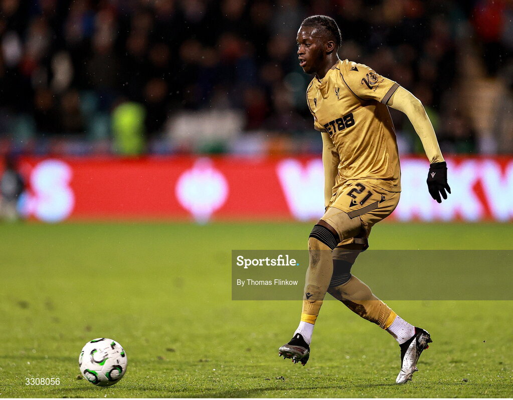 11 December 2025; Romain Esse of Crystal Palace during the UEFA Conference League 2025/26 league phase match between Shelbourne and Crystal Palace at Tallaght Stadium in Dublin. Photo by Thomas Flinkow/Sportsfile