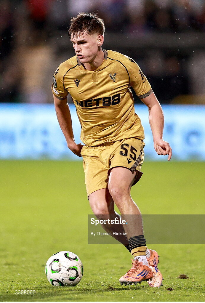 11 December 2025; Justin Devenny of Crystal Palace during the UEFA Conference League 2025/26 league phase match between Shelbourne and Crystal Palace at Tallaght Stadium in Dublin. Photo by Thomas Flinkow/Sportsfile
