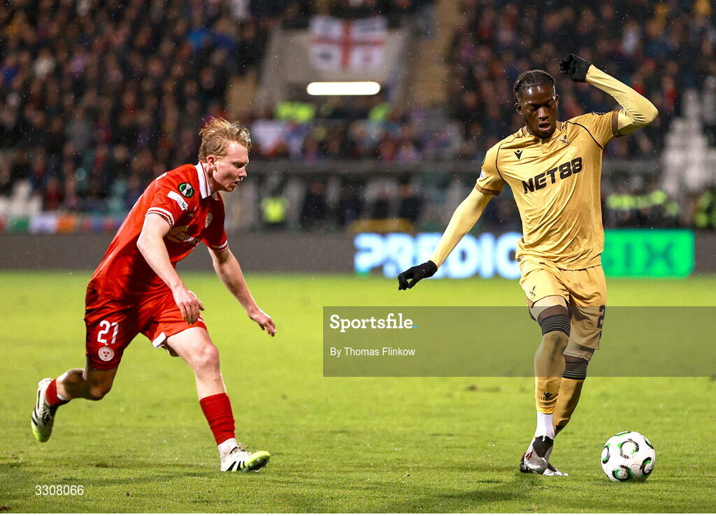 11 December 2025; Romain Esse of Crystal Palace in action against Jack Henry-Francis of Shelbourne during the UEFA Conference League 2025/26 league phase match between Shelbourne and Crystal Palace at Tallaght Stadium in Dublin. Photo by Thomas Flinkow/Sportsfile
