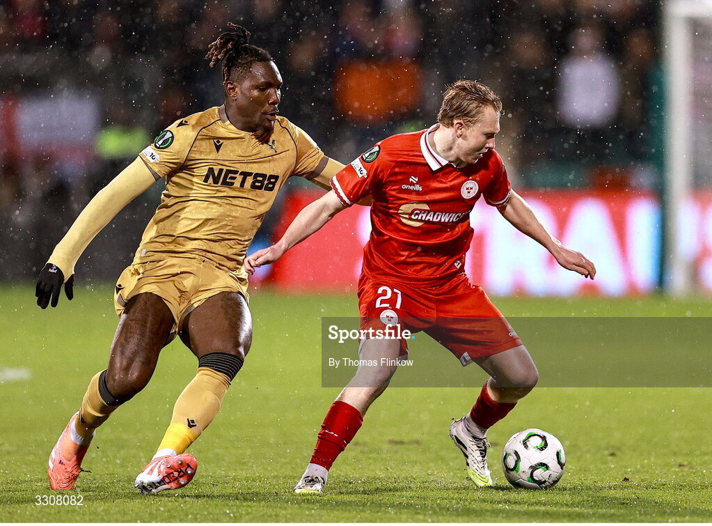 11 December 2025; Jack Henry-Francis of Shelbourne in action against Christantus Uche of Crystal Palace during the UEFA Conference League 2025/26 league phase match between Shelbourne and Crystal Palace at Tallaght Stadium in Dublin. Photo by Thomas Flinkow/Sportsfile