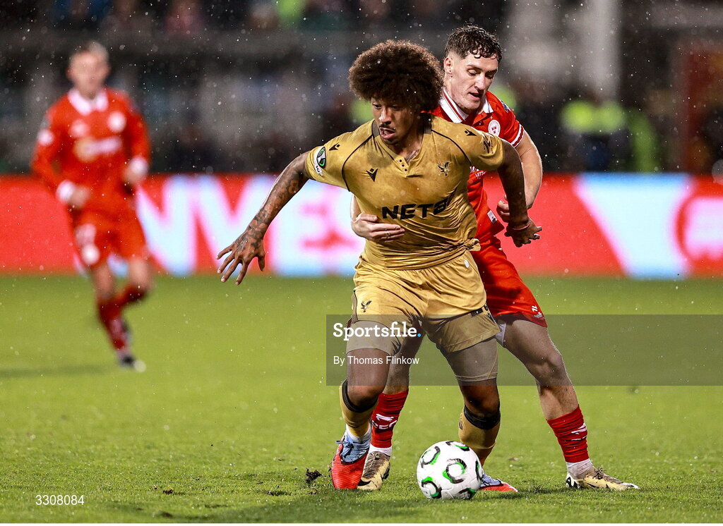 11 December 2025; Chris Richards of Crystal Palace in action against John Martin of Shelbourne during the UEFA Conference League 2025/26 league phase match between Shelbourne and Crystal Palace at Tallaght Stadium in Dublin. Photo by Thomas Flinkow/Sportsfile
