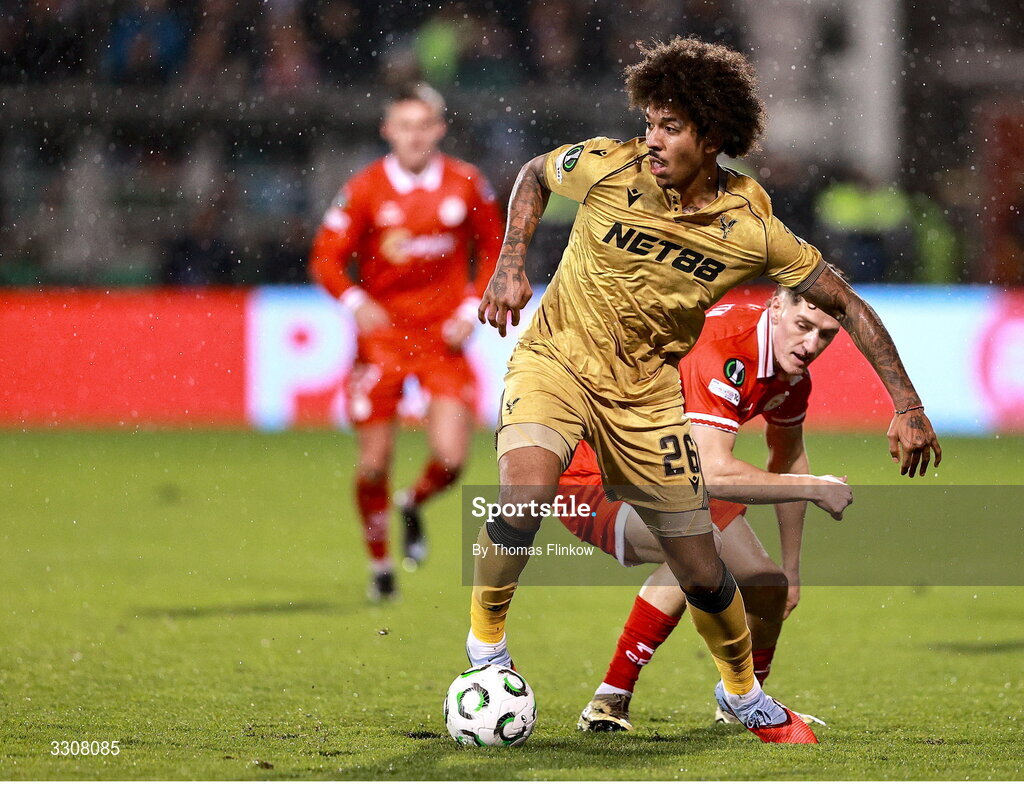 11 December 2025; Chris Richards of Crystal Palace in action against John Martin of Shelbourne during the UEFA Conference League 2025/26 league phase match between Shelbourne and Crystal Palace at Tallaght Stadium in Dublin. Photo by Thomas Flinkow/Sportsfile