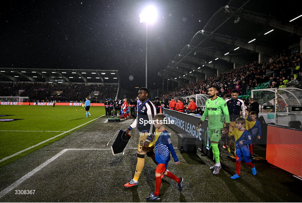 11 December 2025; Crystal Palace captain Marc Guéhi leads his side out before the UEFA Conference League 2025/26 league phase match between Shelbourne and Crystal Palace at Tallaght Stadium in Dublin. Photo by Ben McShane/Sportsfile