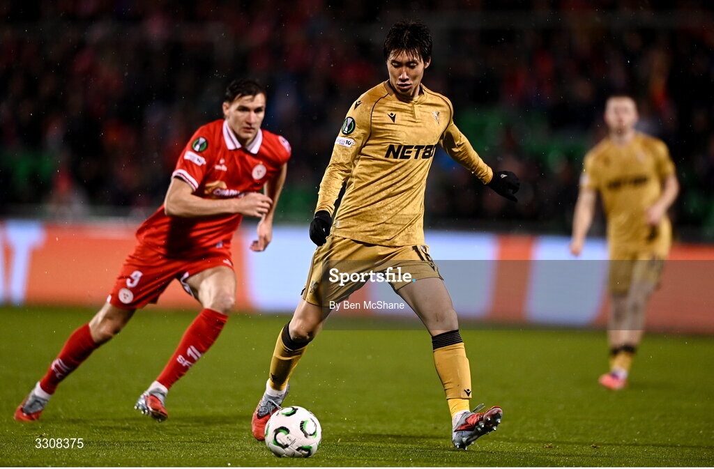 11 December 2025; Daichi Kamada of Crystal Palace and Sean Boyd of Shelbourne during the UEFA Conference League 2025/26 league phase match between Shelbourne and Crystal Palace at Tallaght Stadium in Dublin. Photo by Ben McShane/Sportsfile