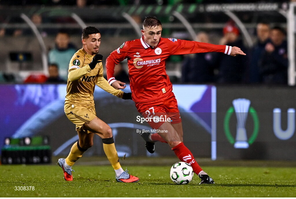 11 December 2025; Evan Caffrey of Shelbourne and Yeremy Pino of Crystal Palace during the UEFA Conference League 2025/26 league phase match between Shelbourne and Crystal Palace at Tallaght Stadium in Dublin. Photo by Ben McShane/Sportsfile